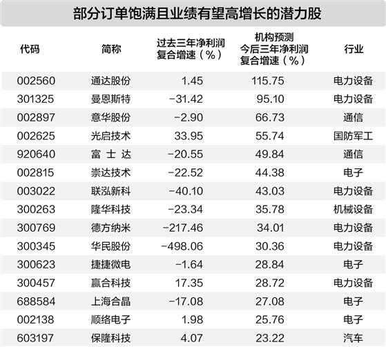 今年11月以来,上市公司通过公开渠道表示自身订单饱满或充足。其中,电力设备行业公司数量超过20家。这些公司订单充足的原因主要是受益于下游需求带动以及公司自身运营效率提升。结合业绩成长性来看,有19家公司净利润复合增速有望超过过去三年。
