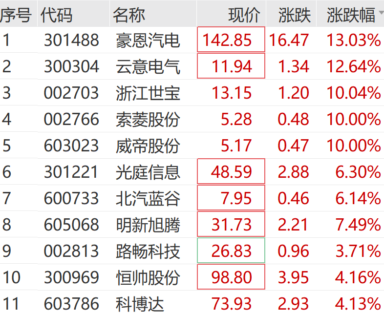 个股方面,浙江世宝竞价涨停,威帝股份、索菱股份等开盘后迅速封板,豪恩汽电、云意电气等涨超10%。