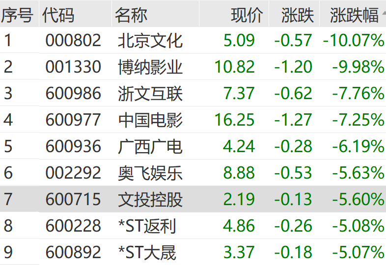 除博纳影业外,上午北京文化跳水跌停,浙文互联、中国电影等多股走低。