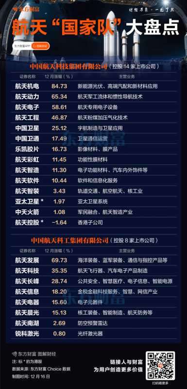 月初以来,商业航天板块表现强势,至今涨幅近11%,板块内多只以“航天”开头的股票轮番领涨。其中航天机电12月涨幅84.73%、航天发展涨幅69.73%、航天动力和航天电子分别涨65.34%和58.61%,以上个股涨幅均超50%。