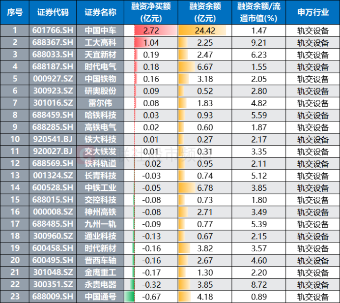 对于可关注标的方面,筛选轨交设备股,截至12月17日数据,累计共有11股月内获融资客加仓。其中,中国中车、工大高科融资净买额相对较高,分别达2.72亿元、1.04亿元,天宜新材、时代电气、中国铁物、研奥股份、雷尔伟、哈铁科技等股融资净买额也居前。