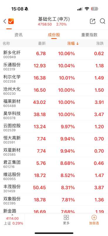 截至1月19日收盘,申万基础化工指数强势拉升至2.70%,报4758.50点。板块内细分龙头集体发力,新乡化纤(000949)、乐通股份(002319)、利尔化学(002258)、沧州大化(600230)、福莱新材(605488)、昊华科技(600378)、云图控股(002539)、恒大高新(002591)、双星新材(002585)等涨停,其中多只个股在午后出现快速拉升并封住涨停。资金布局意愿凸显,行业景气度持续升温。