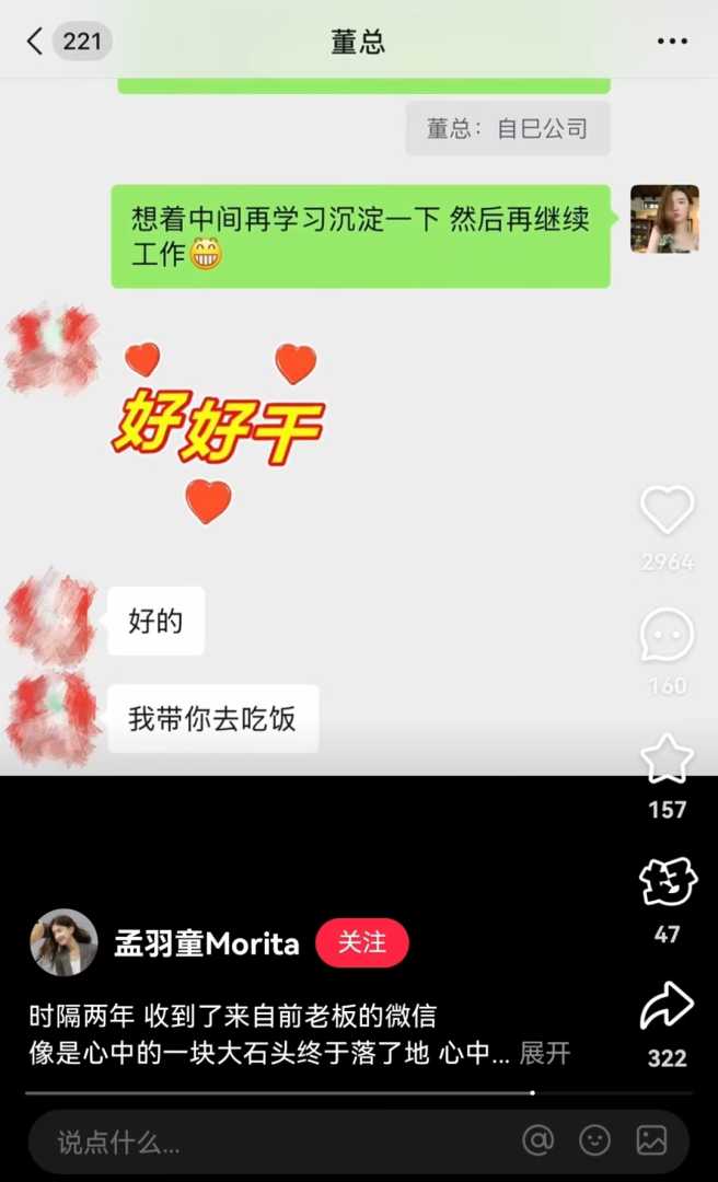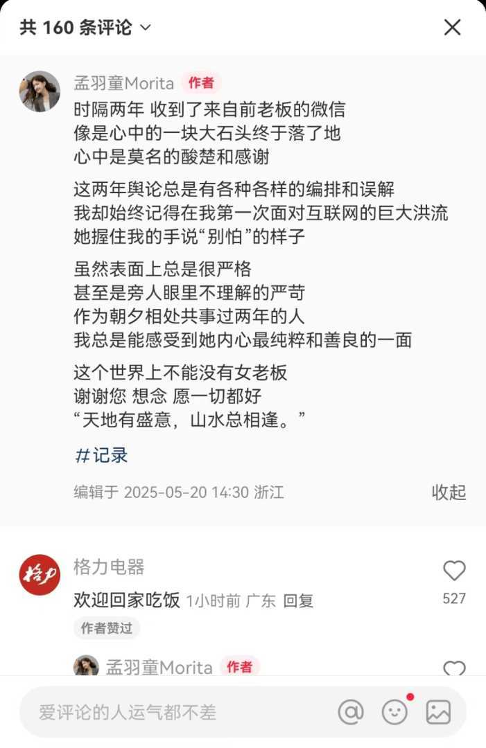5月20日,孟羽童发文称“时隔两年,收到前老板微信”,图片显示对话对方为“董总”,邀请“我带你去吃饭”。评论区中,格力电器账号留言:“欢迎回家吃饭”。