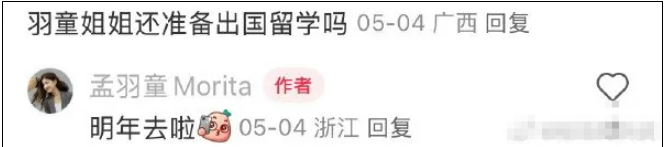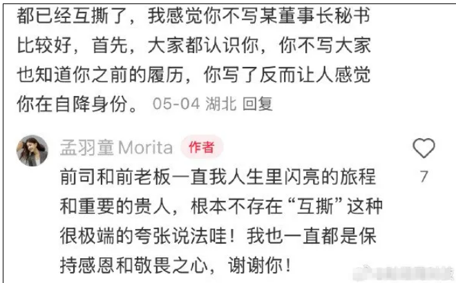 据封面新闻,5月初,网友建议孟羽童别提某董事长秘书身份,孟羽童回应:“前司和前老板是我人生重要旅程和贵人,我一直感恩。”