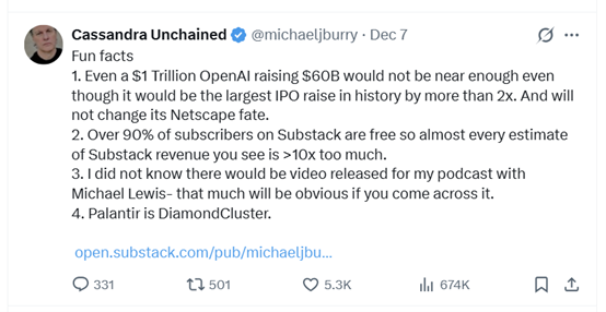 今年10月底有消息称,OpenAI正筹备IPO,此次IPO对该公司的估值或高达1万亿美元。上个月,Burry高调宣布做空英伟达并对其口诛笔伐。上周日下午,他又发帖称需要更多证明英伟达囤积GPU的证据。