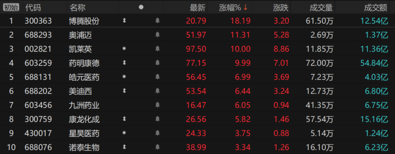 今日上午,CXO概念股集体发力,药明康德、凯莱英涨停,博腾股份涨超18%,奥浦迈涨超11%,美迪西、皓元医药等多股跟涨。