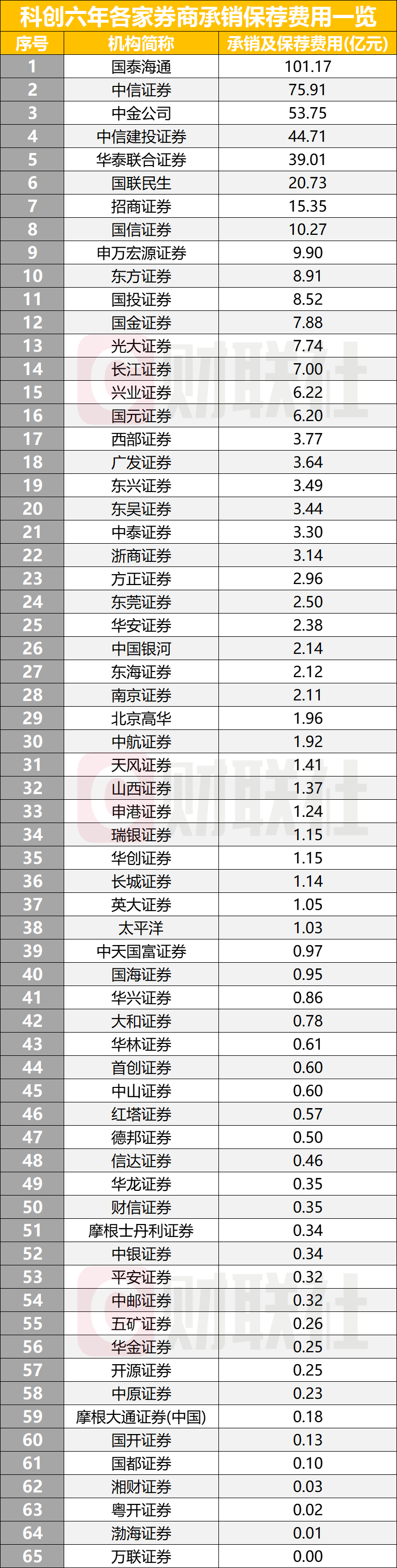 国泰海通证券以101.17亿元的收入稳居行业第一,中信证券实现收入75.91亿元。承销保荐收入排名前十的券商还有国信证券等。
