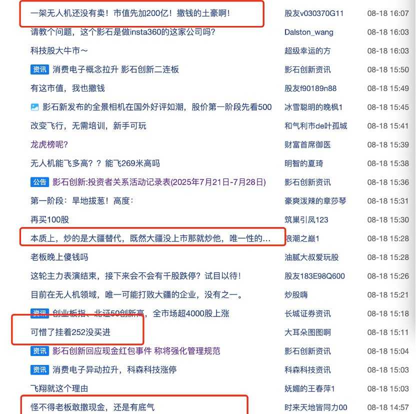 在牛市氛围烘托之下,股民涌入影石创新,有网友表示,“科技股大牛市”,也有网友直言:“一架无人机还没有卖,市值先加了200亿元”“有这市值,我也撒钱”等,也有网友惋惜“没有买进”,股吧热闹非凡。