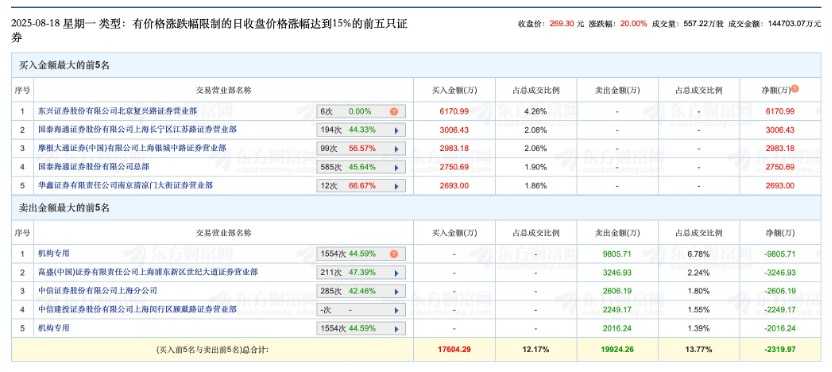 净卖出方面,具体来看,两机构席位合计净卖出1.18亿元。此外,东兴证券北京复兴路证券营业部、国泰海通证券上海长宁区江苏路证券营业部分别买入6170.99万元、3006.43万元;高盛(中国)证券上海浦东新区世纪大道证券营业部、中信证券上海分公司分别卖出3246.93万元、2606.19万元。