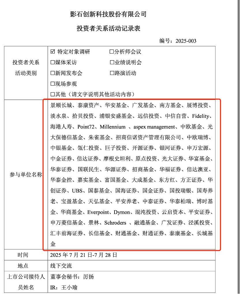 此外,影石创新当前也获得基金公司频繁调研,仅7月以来,公司就公告三次投资者调研,从7月初的三五家基金公司,到最新7月28日公告显示,公司接待来自公私募、国内资管机构的调研达50多家。