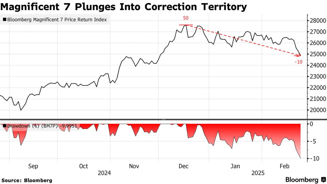 美股“七巨头”指数进入调整区间。过去两年,标普500指数的大部分涨幅由七家最大公司(苹果、英伟达、微软、Alphabet、亚马逊、Meta和特斯拉)推动。而这七家公司2025年开局不顺,陷入调整区间,市值蒸发约1.4万亿美元。