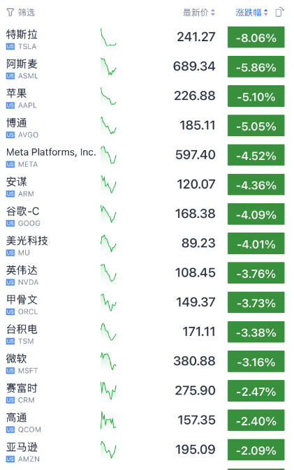 特斯拉股价下跌超过8%,谷歌和Meta下跌超过4%,人工智能热门股英伟达下跌近4%。