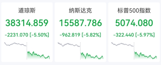 特朗普关税战让美国股市陷入动荡。美股周五低开低走,三大指数全天震荡下行。截至收盘,道指跌2231点或5.5%,报38314.86点;纳指跌5.82%,报15587.79点;标普500指数跌5.97%,报5074.08点。其中,道指创下2020年6月以来最大单日跌幅,标普500指数创下2020年3月中旬以来最大单日跌幅。纳指较前期高位跌幅已达22%,跌入技术性熊市。