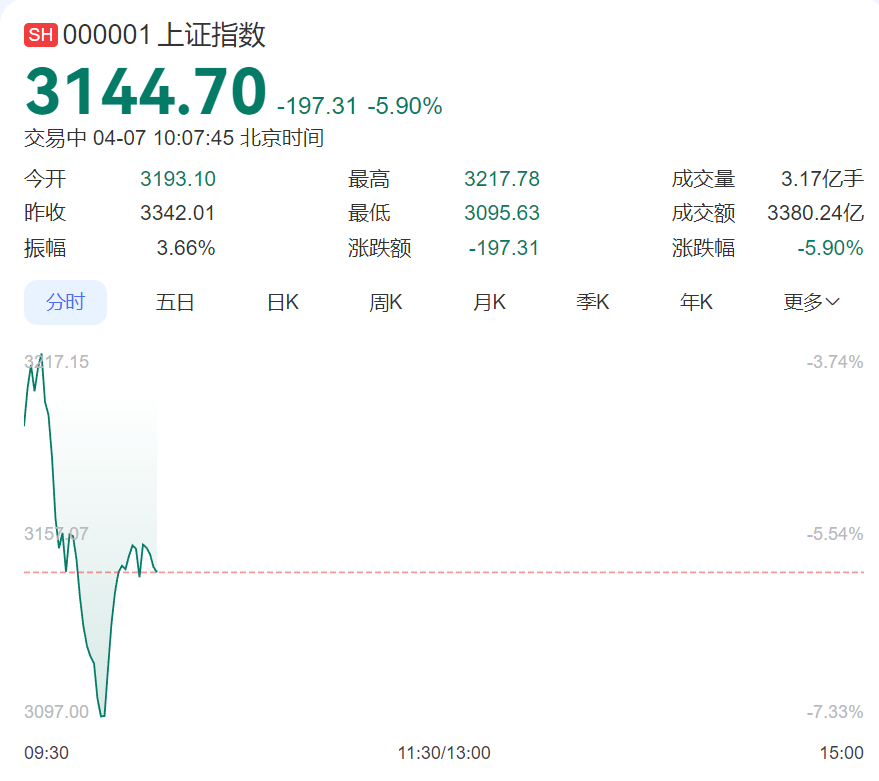 在A股市场,沪指一度下跌超过7%,但随后收窄至5.9%。深证成指和创业板指也分别下跌超过7%和9%。