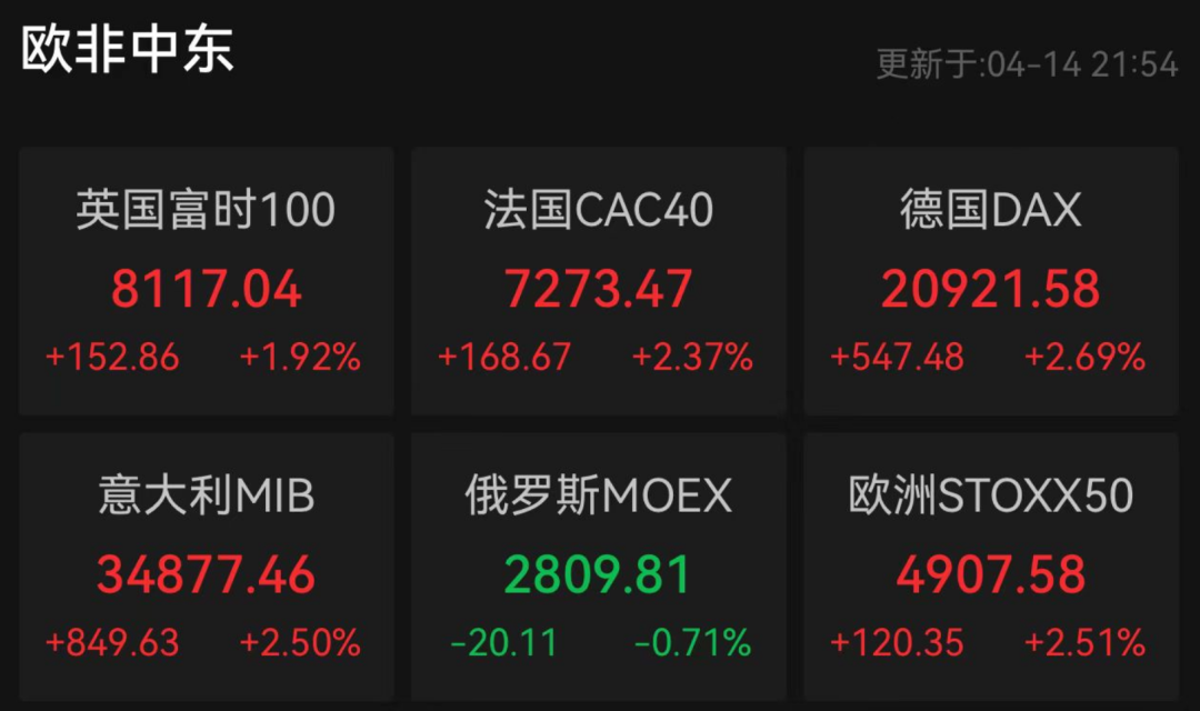 欧洲股市也普遍大涨,法国CAC40、德国DAX、意大利MIB、欧洲STOXX50等指数均涨超2%,全球股市呈现回暖迹象。
