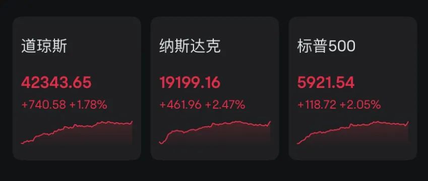 当地时间周二,美国三大股指全线收涨。截至收盘,道指涨1.78%报42343.65点,标普500指数涨2.05%报5921.54点,纳指涨2.47%报19199.16点,股市看大盘趋势向好。