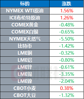 贵金属市场方面,COMEX黄金期货收跌0.48%,报3312.4美元/盎司;COMEX白银期货则收跌0.65%,报33.095美元/盎司。