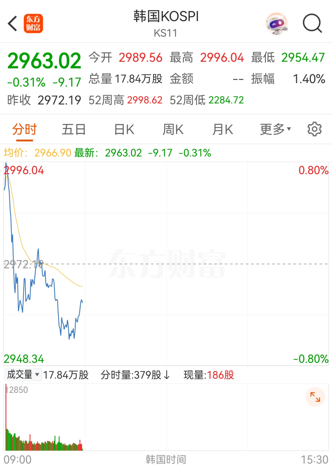 韩国股市则高开低走,韩国综合指数盘中一度上涨0.8%,不过随后大幅跳水并翻绿,跌幅一度达到0.60%。截至券商中国记者发稿,日经225指数下跌0.83%,韩国综合指数下跌0.31%。