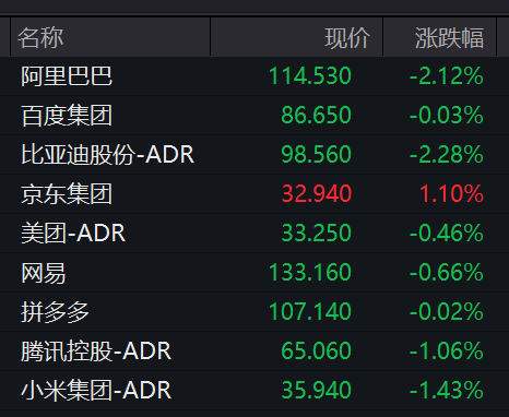 中概科技龙头跌多涨少,万得中概科技龙头指数跌超1%。个股方面,阿里巴巴、比亚迪股份均跌超2%,美股市场科技股表现分化显著。