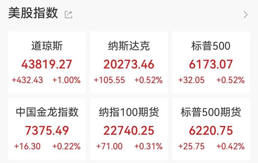 周五(6月27日),欧美股市集体收涨,纳指、标普500指数创历史新高。美股方面,道琼斯工业指数涨1%,报43819.27点;标普500指数涨0.52%,报6173.07点;纳斯达克指数涨0.52%,报20273.46点,均创历史新高。本周,道琼斯工业指数涨3.82%,标普500指数涨3.44%,纳斯达克指数涨4.25%。