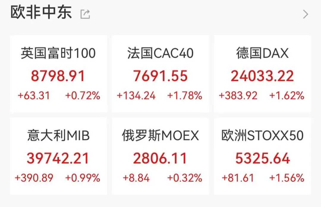 欧洲股市方面,德国DAX指数涨1.62%,报24033.22点;法国CAC40指数涨1.78%,报7691.55点;英国富时100指数涨0.72%报8798.91点。本周,德国DAX指数涨2.92%,法国CAC40指数涨1.34%,英国富时100指数涨0.28%。纳斯达克中国金龙指数涨0.22%,热门中概股涨跌不一。