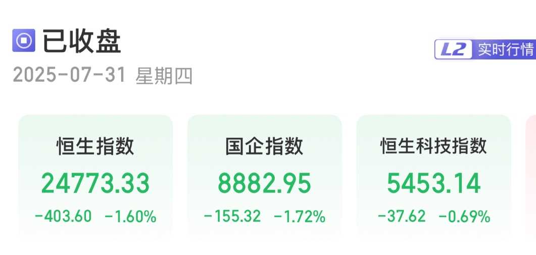 7月31日,港股三大指数飘绿。截至收盘,恒生指数跌1.6%,报24773.33点;恒生国企指数跌1.72%,报8882.95点;恒生科技指数跌0.69%,报5453.14点。