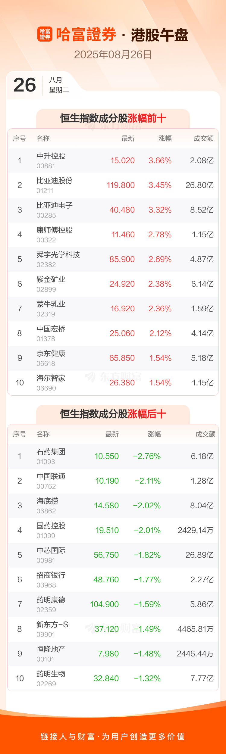 港股8月26日午盘呈现走低态势,恒生指数收报25773.56点,跌56.35点,跌幅0.22%,市场整体氛围略显谨慎;而恒生科技指数则收报5840.71点,涨15.62点,涨幅0.27%,展现出一定的抗跌性。在恒生指数成分股中,中升控股、比亚迪股份、比亚迪电子涨幅居前,成为市场亮点,而石药集团、中国联通、海底捞则跌幅靠前,面临一定压力。恒生科技指数成分股中,比亚迪股份、比亚迪电子、商汤-W同样涨幅领先,而蔚来-SW、ASMPT、中芯国际则跌幅较大,市场表现分化明显。港股市场