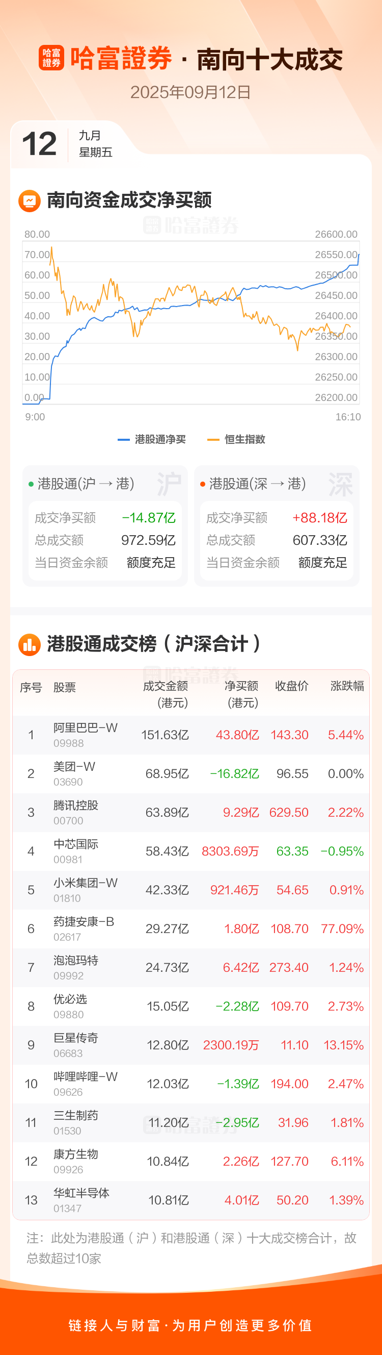 9月12日恒生指数涨1.16%,收报26388.16点,南向资金净买入港股73.31亿港元,市场活跃度提升。阿里巴巴-W等获净买入,美团-W等遭净卖出。