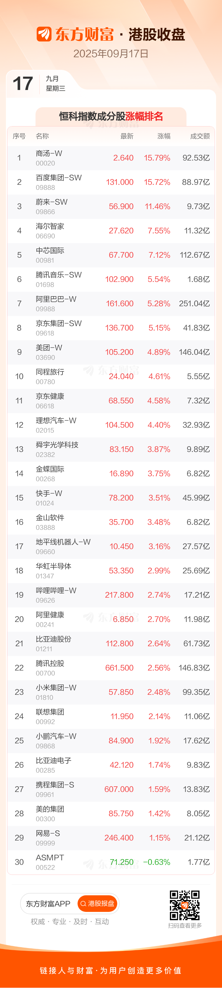 港股9月17日收盘显著走高,恒生指数收报26908.39点,涨469.88点,涨幅达1.78%,港股市场表现强劲;恒生科技指数收报6334.24点,涨256.58点,涨幅高达4.22%,科技股领涨明显。恒生指数成分股中,百度集团-SW、海尔智家、中芯国际涨幅居前,展现出良好的市场表现,而信义玻璃、中国生物制药、石药集团则跌幅靠前。恒生科技指数成分股中,商汤-W、百度集团-SW、蔚来-SW同样涨幅领先,ASMPT、网易-S、美的集团则有所下跌。
