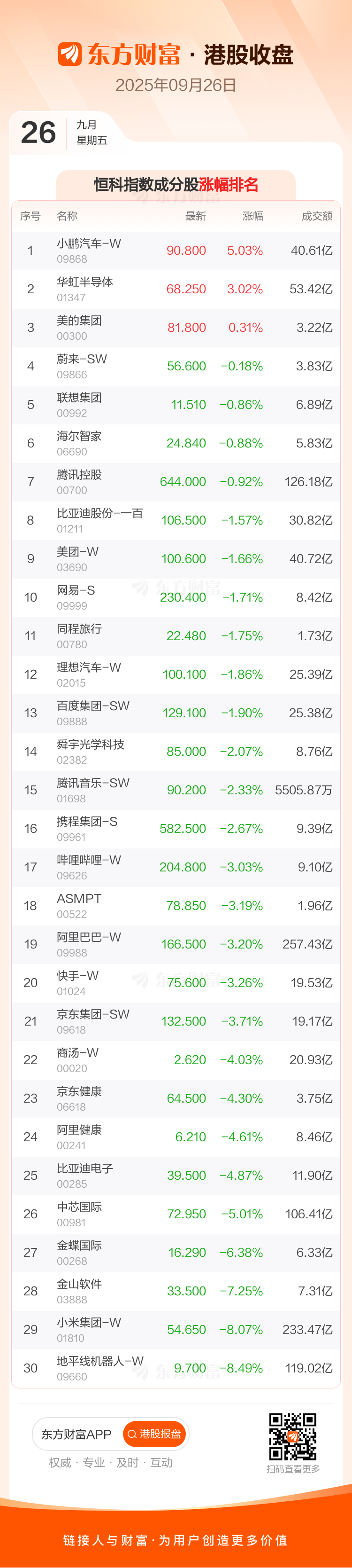 9月26日港股收盘,恒生指数跌1.35%,恒生科技指数跌2.89%。恒生银行等涨幅居前,小米集团-W等跌幅靠前。