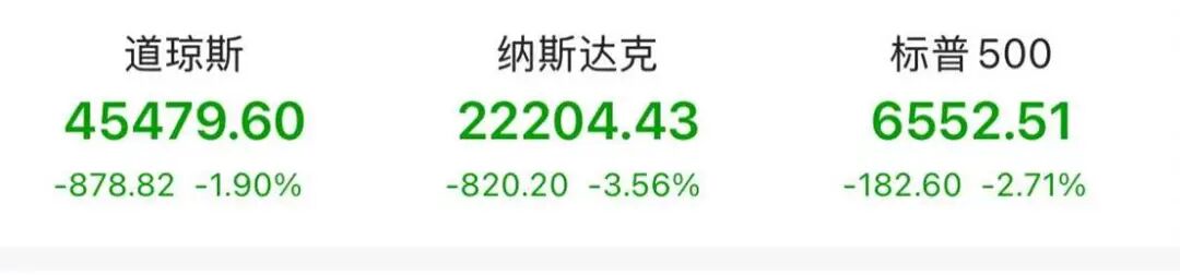美东时间周五,美股遭遇“黑色星期五”:美股三大指数高开后盘中跳水,跌幅持续扩大,最终以三大指数集体收跌(股市看大盘),且标普500指数和纳指均创下4月以来最大单日跌幅收尾。具体来看,标普500指数跌2.71%,报6552.51点;纳斯达克综合指数跌3.56%,报22204.43点;道琼斯指数跌1.9%,报45479.6点。