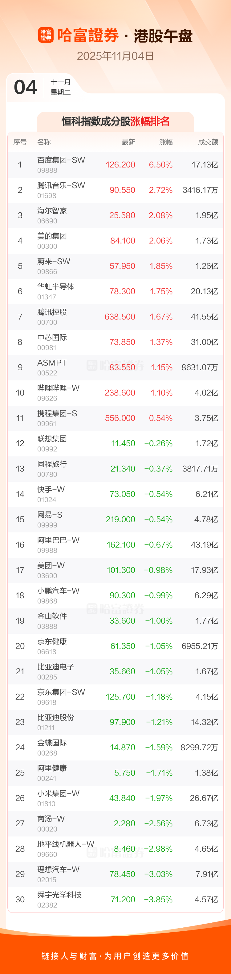 港股11月4日午盘:恒生指数微涨,科技股走势分化