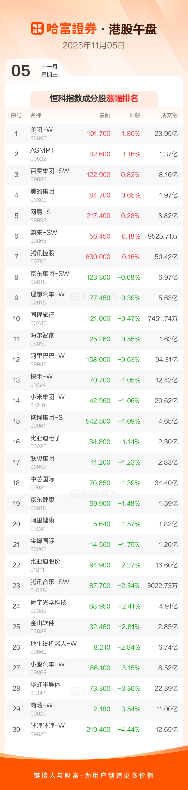 11月5日港股午盘走低,恒生指数跌0.28%,科技指数跌0.8%。成分股中康师傅、李宁等涨幅居前,新东方、舜宇光学等跌幅靠前。科技指数成分股美团、ASMPT等涨幅居前,哔哩哔哩等跌幅靠前。