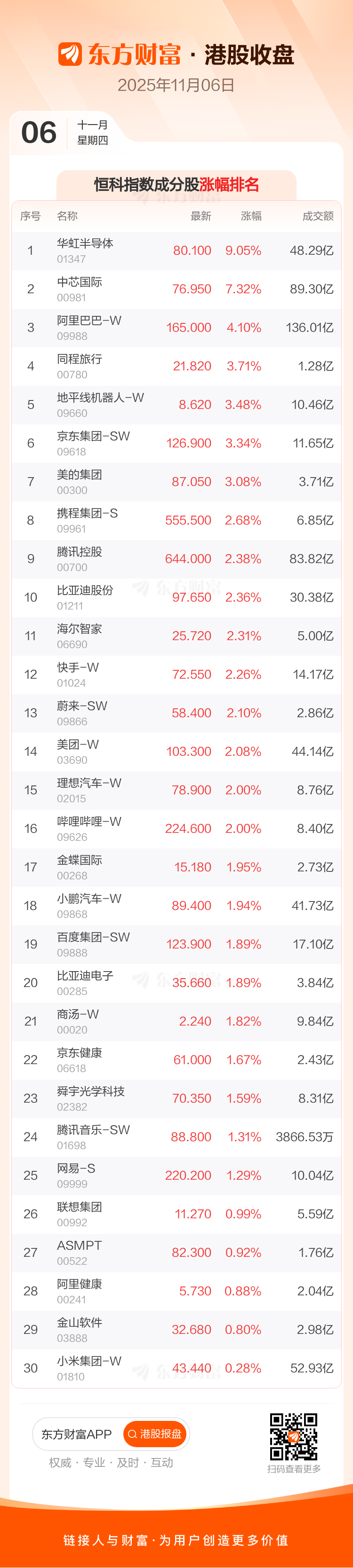 港股11月6日收盘:恒生指数与科技指数双双走高