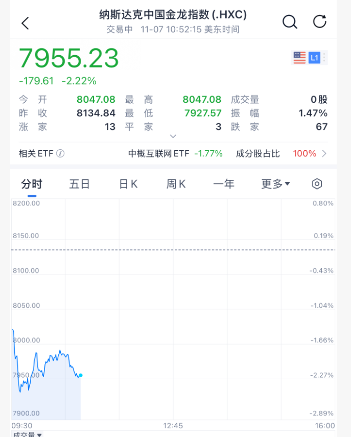 纳斯达克指数正走向自四月“关税引发的抛售潮”以来最糟糕的一周——彼时英伟达和苹果等巨头主导的指数一度跌入熊市。中概股指数跌超2%,热门的AI科技股集体下跌,市场对AI热门股估值的担忧浮现。