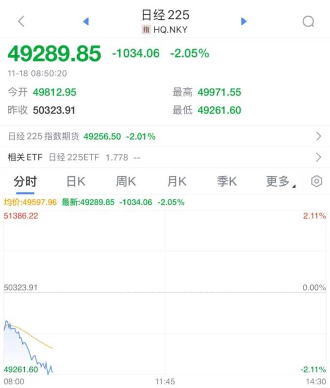 11月18日,日本股市开盘大幅走低,日经225指数跌超2%,东证指数也跌超1.5%。受隔夜美股科技股走低及高市早苗言论影响,日本股市个股纷纷下挫。同时,韩国股市也显著下挫。日本舆论认为,高市早苗的错误言论将导致日本经济受到进一步冲击。