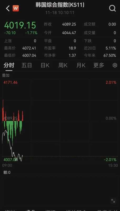 除了日本股市之外,11月18日开盘,韩国股市也显著下挫。截至发稿,韩国综合指数跌幅超1.7%。全球股市的动荡,仍在持续。
