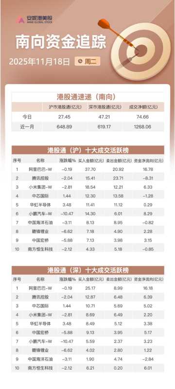 恒指今日加速下探,南向资金全天净买入约74.66亿港元。其中,沪港股通净流入约27.45亿港元,深港股通净流入约47.21亿港元,港股通资金流向分化明显。